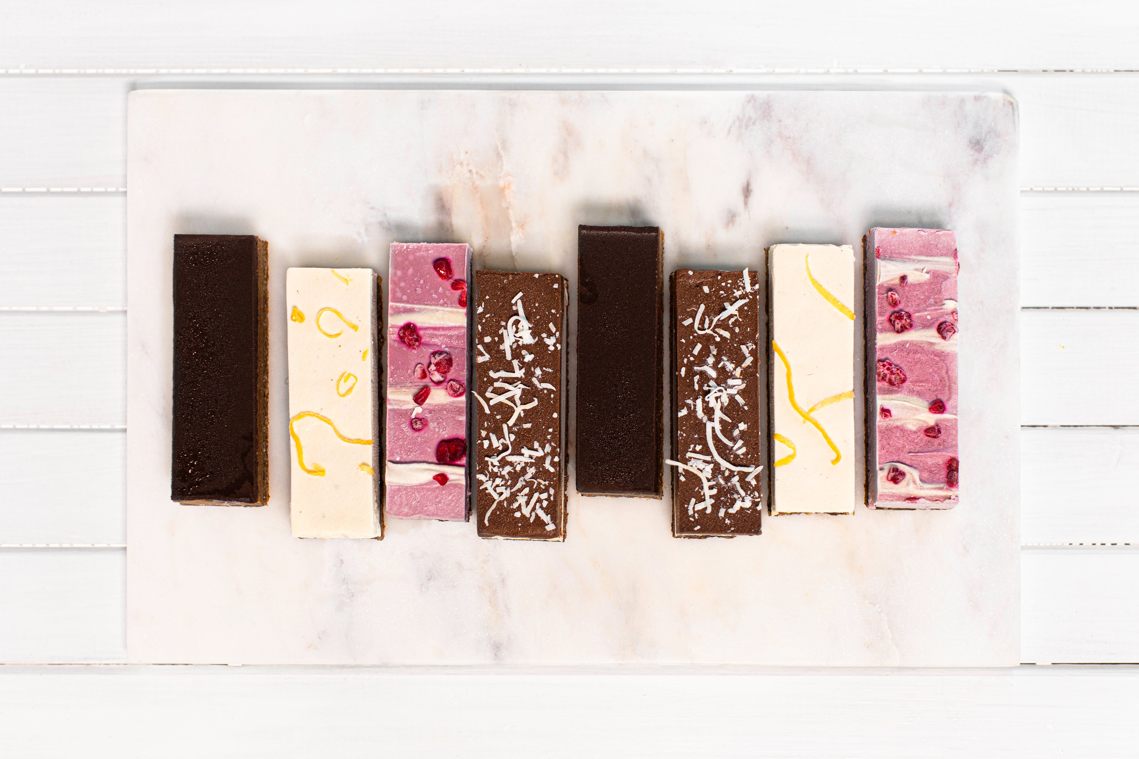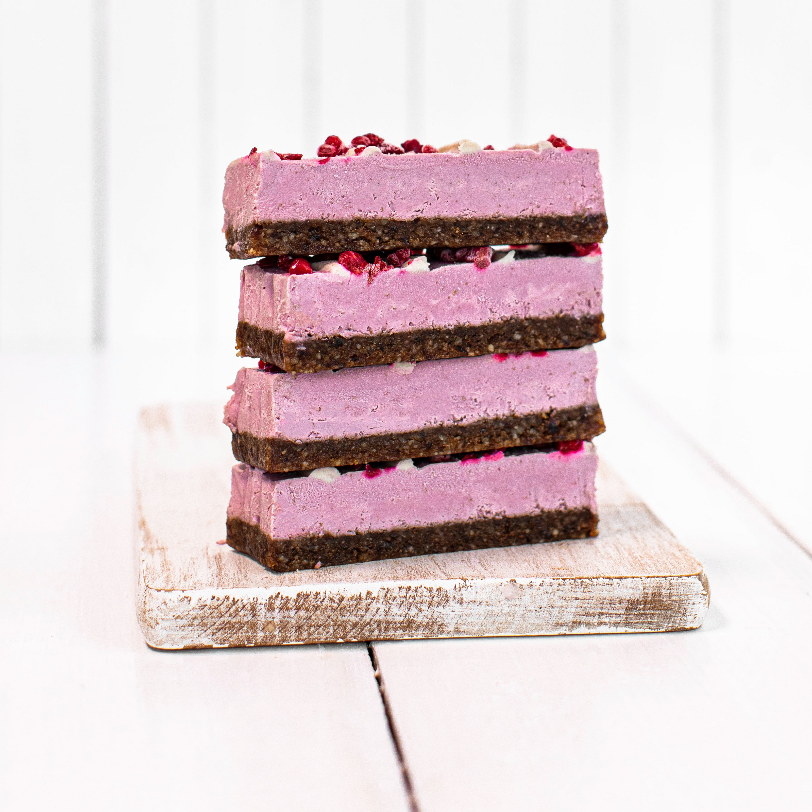 These decadent dessert slices are transported and sold frozen and are ready for immediate consumption either frozen or slightly thawed. They can be enjoyed as an on-the-go snack, a dessert or elegant finger food when entertaining.