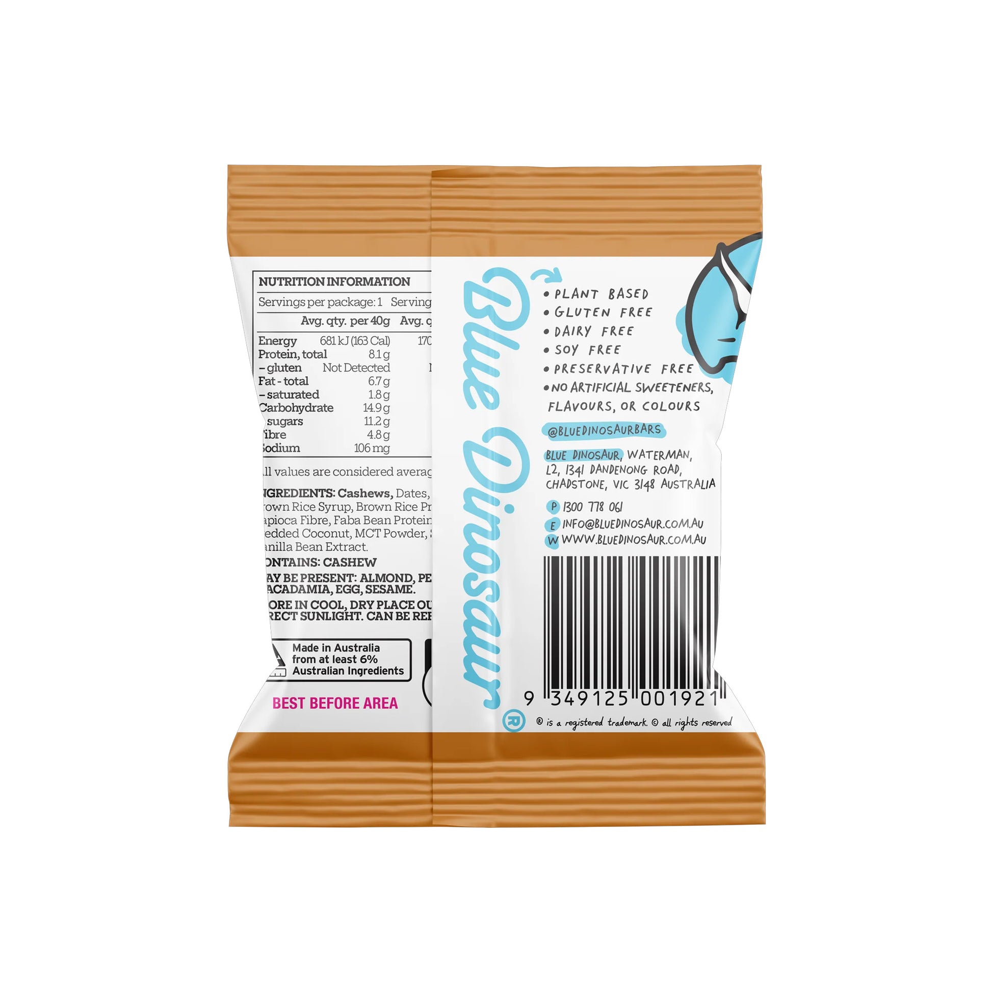 Dates, Cashews, Brown Rice Syrup, Tapioca Fibre, Brown Rice Protein, Faba Bean Protein, Shredded Coconut, MCT Powder, Sea Salt, Vanilla Bean Extract
