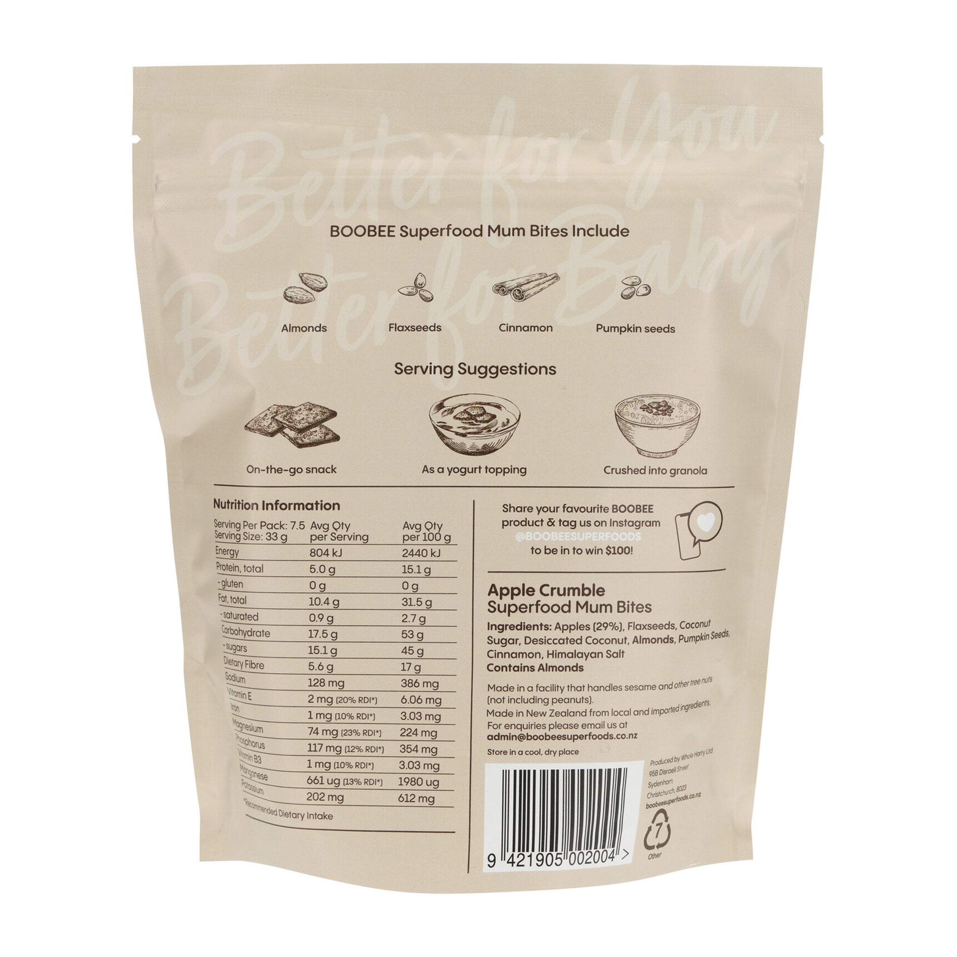 BOOBEE bites are a guilt-free sweet snack powered by the goodness of fruits and seeds. Naturally gluten and refined sugar free, our Mum Bites are a delicious crunchy alternative to highly processed lactation cookies and bars currently on the market. With a combination of premium superfoods and nutritious ingredients that gives mums a boost right when it is needed the most.