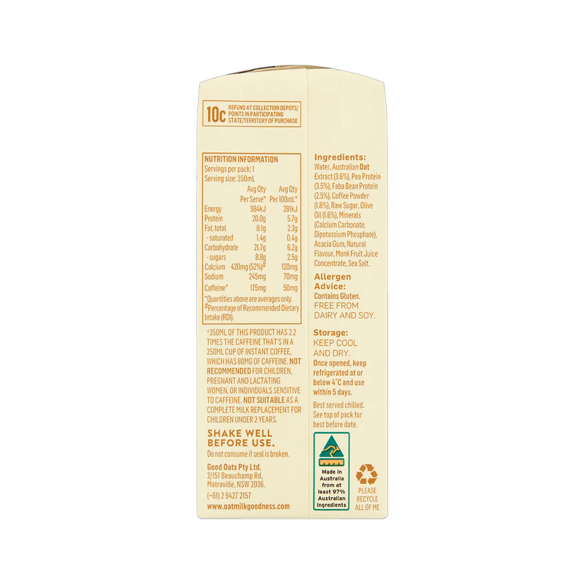 Water, Australian Oat Extract (3.6%), Pea Protein (3.5%), Fava Bean Protein (2.5%), Coffee Powder (1.8%), Raw Sugar, Olive Oil (1.6%), Minerals (Calcium Carbonate, Dipotassium Phosphate), Acacia Gum, Natural Flavour, Monk Fruit Juice Concentrate, Sea Salt.