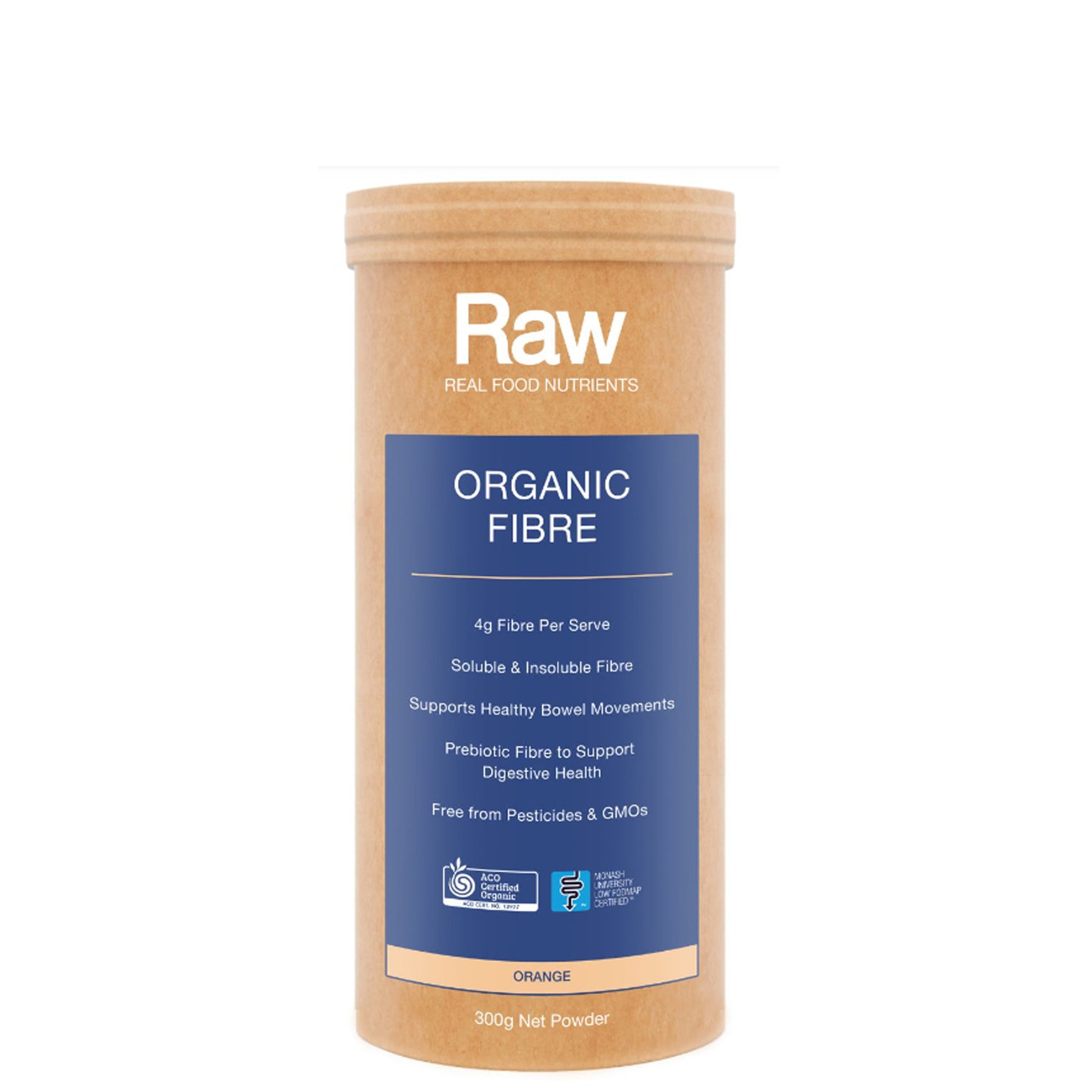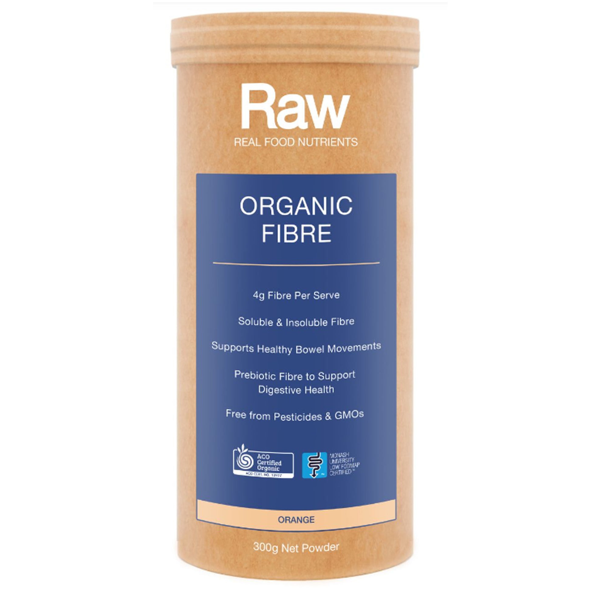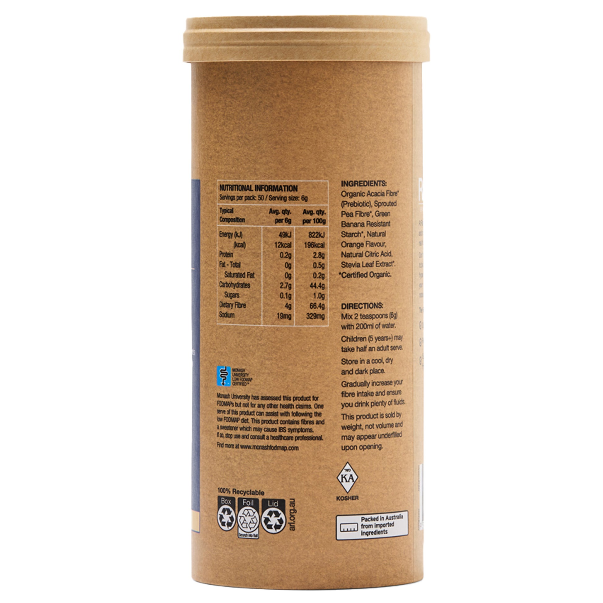 Organic Acacia Fibre* (Prebiotic), Sprouted Pea Fibre*, Green Banana Resistant Starch*, Natural Orange Flavour, Natural Citric Acid, Stevia Leaf Extract*. *Certified Organic