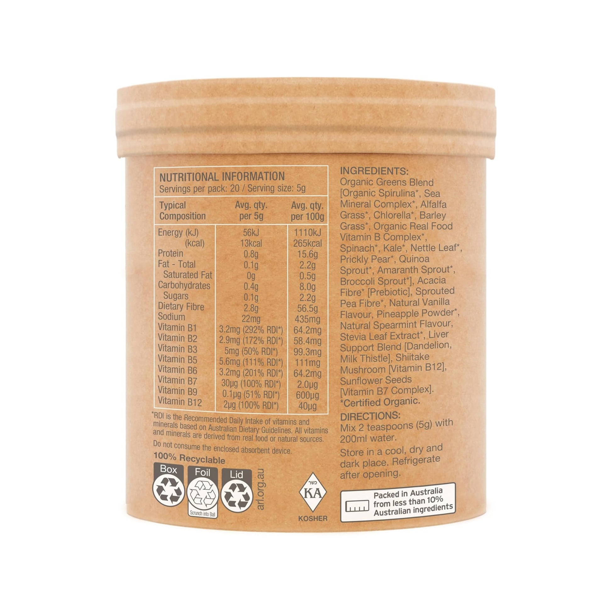 Organic Greens Blend [Organic Spirulina*, Sea Mineral Complex*, Alfalfa Grass*, Chlorella*, Gluten Free Wheat Grass*, Barley Grass*, Organic Vitamin B Complex*, Spinach*, Kale*, Nettle Leaf*, Prickly Pear*, Quinoa Sprout*, Amaranth Sprout*, Broccoli Sprout*], Acacia Fibre* [Prebiotic], Sprouted Pea Fibre*, Natural Vanilla Flavour, Pineapple Powder*, Natural Spearmint Flavour, Stevia Leaf Extract*, Liver Support Blend [Dandelion, Milk Thistle], Shiitake Mushroom [Vitamin B12], Sunflower Seeds [Vitamin B7 Complex]. *Certified Organic