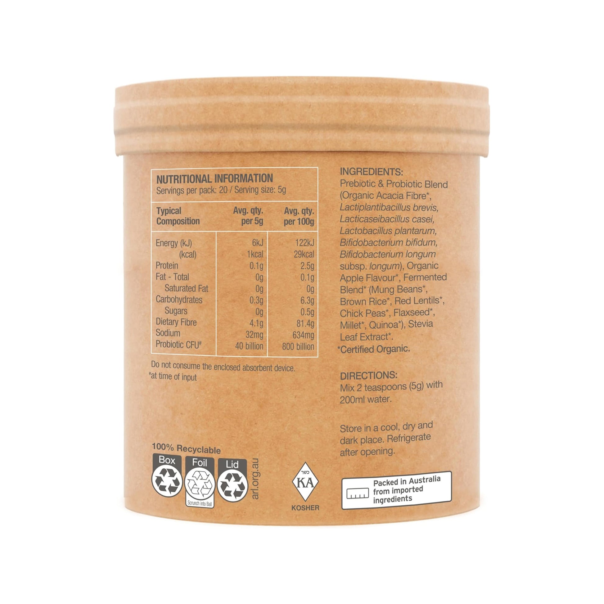 Prebiotic & Probiotic Blend (Organic Acacia Fibre*, Lactiplantibacillus brevis, Lacticaseibacillus casei, Lactobacillus plantarum, Bifidobacterium bifidum, Bifidobacterium longum subsp. longum), Organic Apple Flavour*, Fermented Blend* (Mung Beans*, Brown Rice*, Red Lentils*, Chickpeas*, Flaxseed*, Millet*, Quinoa*), Stevia Leaf Extract*. *Certified Organic
