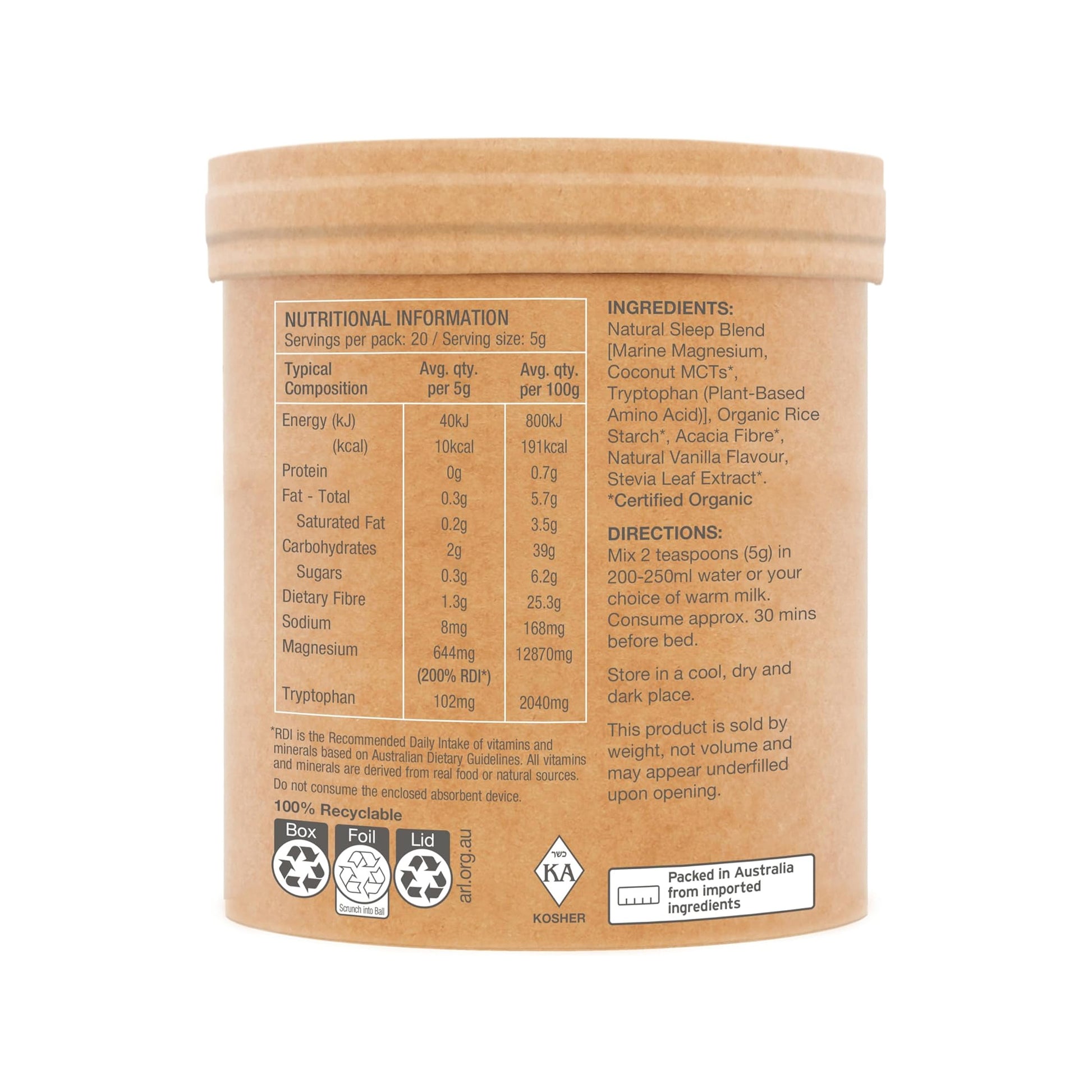 Natural Sleep Blend [Marine Magnesium, Coconut MCTs*, Tryptophan (Plant-Based Amino Acid)], Organic Rice Starch*, Acacia Fibre*, Natural Vanilla Flavour, Stevia Leaf Extract*. *Certified Organic