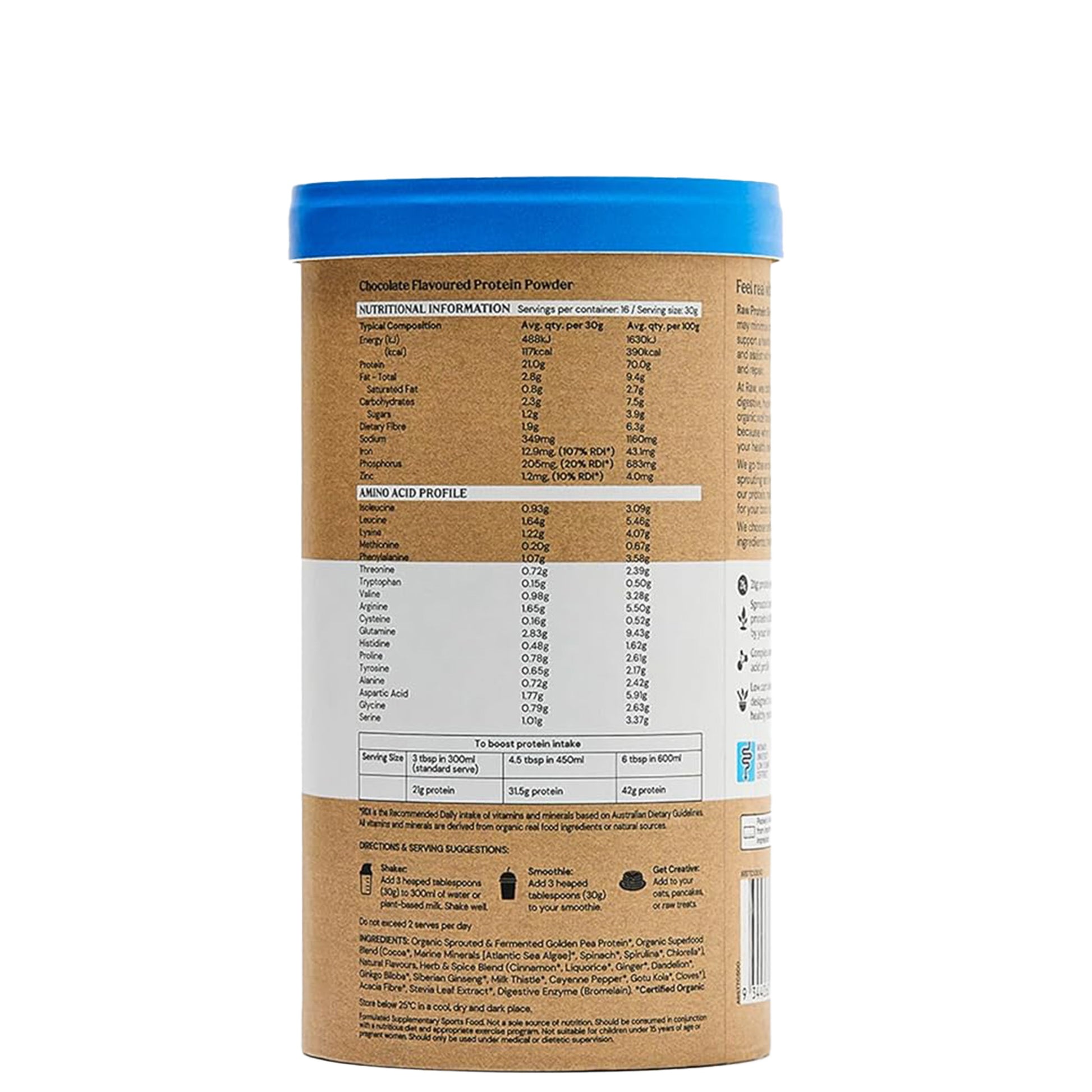 Organic Sprouted & Fermented Golden Pea Protein*, Superfood Blend (Organic Cocoa*, Sea Mineral Complex [74+ Trace Minerals], Organic Spinach*, Organic Spirulina*, Organic Chlorella*), Natural Flavours, Herb & Spice Blend (Organic Cinnamon*, Organic Liquorice*, Organic Ginger*, Organic Dandelion*, Organic Ginkgo Biloba*, Organic Siberian Ginseng*, Organic Milk Thistle*, Organic Cayenne Pepper*, Organic Gotu Kola*, Organic Cloves*), Organic Acacia Gum*, Organic Stevia Leaf Extract*, Digestive Enzyme (Bromelain). *Certified Organic