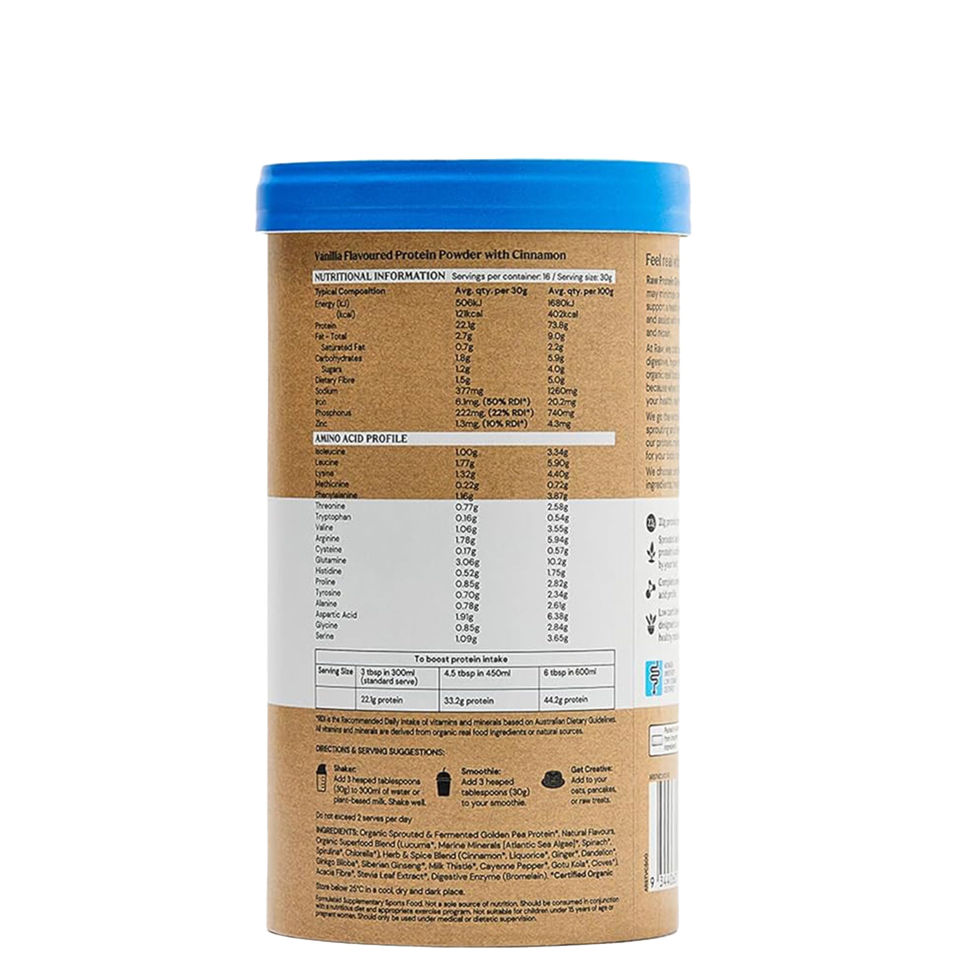 Organic Sprouted & Fermented Golden Pea Protein*, Natural Flavours, Superfood Blend (Organic Lucuma*, Sea Mineral Complex [74+ Trace Minerals], Organic Spinach*, Organic Spirulina*, Organic Chlorella*), Herb & Spice Blend (Organic Cinnamon*, Organic Liquorice*, Organic Ginger*, Organic Dandelion*, Organic Ginkgo Biloba*, Organic Siberian Ginseng*, Organic Milk Thistle*, Organic Cayenne Pepper*, Organic Gotu Kola*, Organic Cloves*), Organic Acacia Gum*, Organic Stevia Leaf Extract*, Digestive Enzyme (Bromelain). *Certified Organic