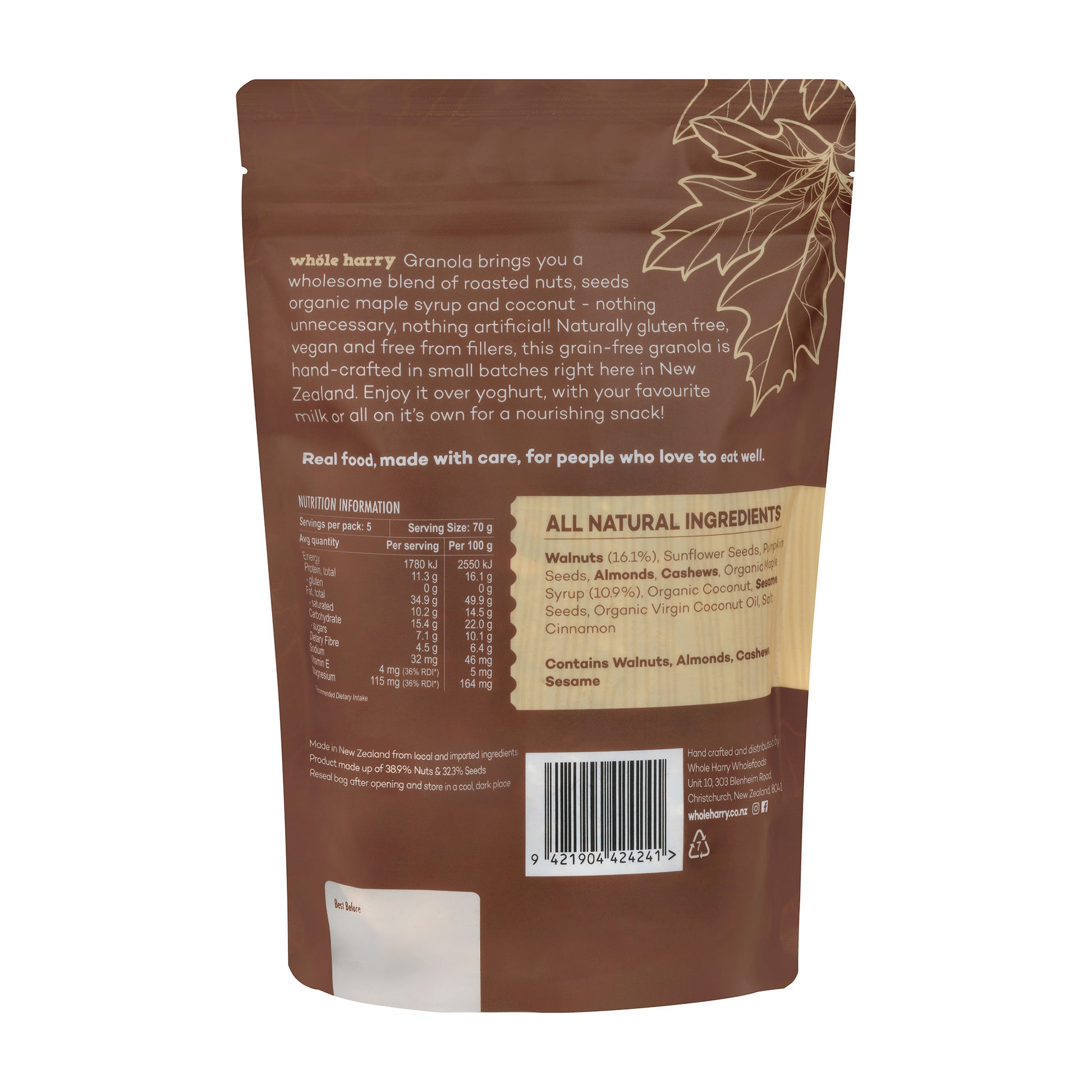 Whole Harry Granola brings you a wholesome blend of roasted nuts, seeds, organic maple syrup and coconut - nothing unnecessary, nothing artificial! Naturally gluten free, vegan and free from fillers, this grain-free granola is hand-crafted in small batches right here in New Zealand.